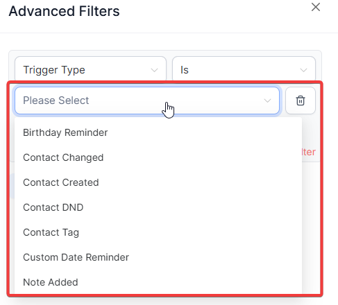 3. Setting Your Filters: Choose from various filtering options such as triggers (e.g., form submissions), actions (e.g., sending an SMS), tags, or other workflow attributes like status or modification date.