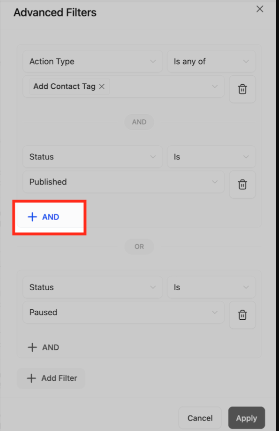 - Advanced Filters (One-Time Use): Advanced Filters allow you to apply conditions on-the-fly to find specific workflows without saving the filter. For example, you may want to quickly see all workflows in a specific state, like “Paused,” and view them immediately. Once you’re done, you can exit without saving the filter.
