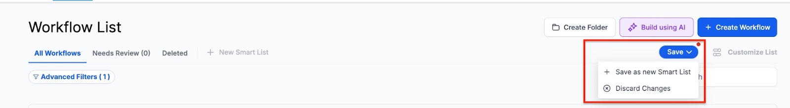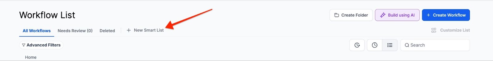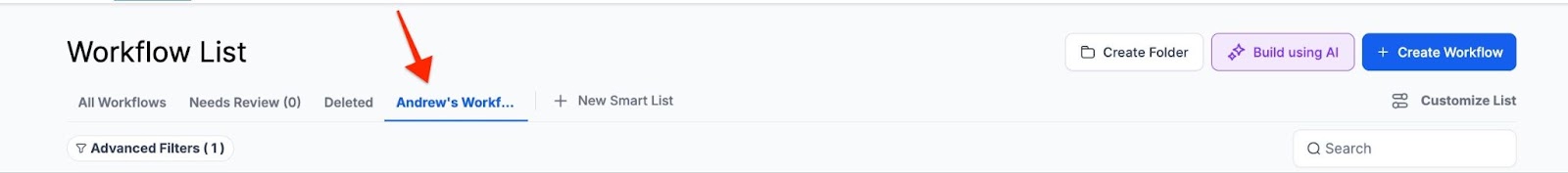 3. Accessing Your Smart Lists: Saved Smart Lists will appear at the top of your workflows page. Click on any Smart List to instantly access the filtered results.